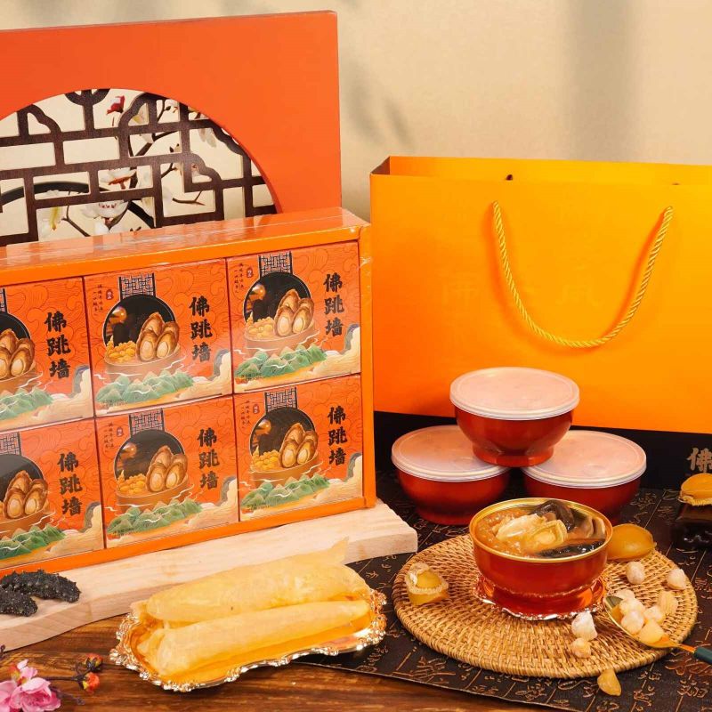 Utilize the contents of the box to create delectable seafood-stuffed dumplings. The premium ingredients in Buddha Jumping Over the Wall can be folded into dumpling wrappers, steamed, and served as a delightful and unique dim sum option.